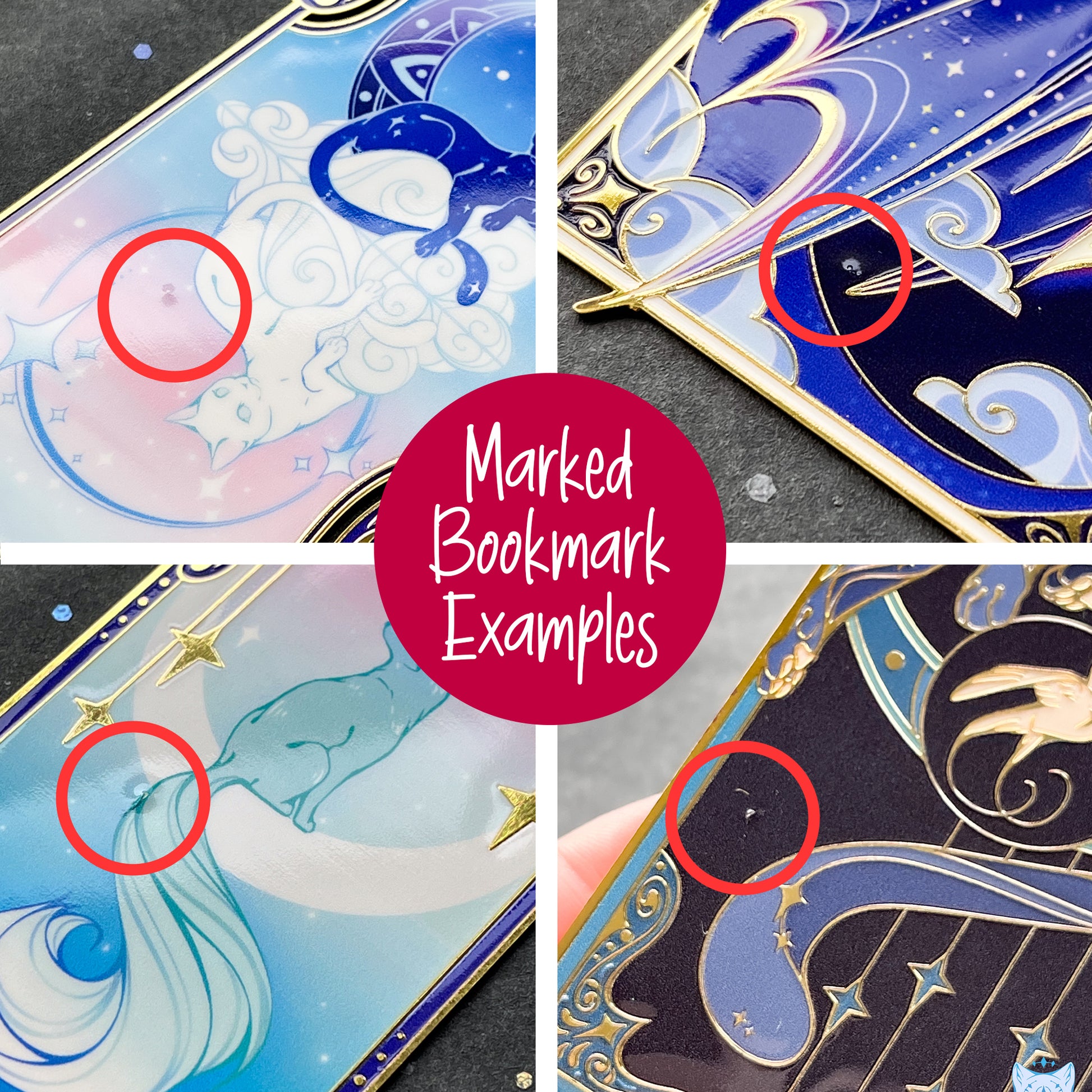 These bookmarks are hand-finished, and small dust/bubble marks are common, but can mostly only be seen from close up and at a certain angle.